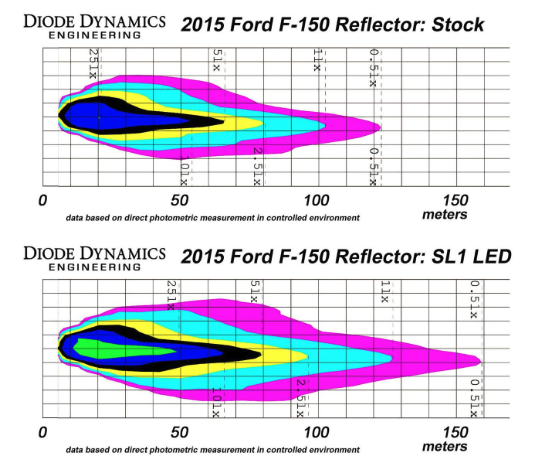 Tested to Perform. We test the SL1 bulb in factory headlamps, and measure the entire beam pattern using specialized equipment. It's an elaborate affair: a headlight is mounted to a computer-controlled rotating head called a goniometer. Light shines down a tunnel, where a sensor collects data as the headlight is rotated. The entire beam pattern is mapped, and we compare the total output to the original halogen, confirming that the SL1 bulb shines more light in the hotspot, without adding extra glare on the road. The test results speak for themselves: in most lamps, like the 2015 F-150 Halogen lamp, there is 30-70% more light in the critical hotspot, with no added glare or spread of light. With proper optical engineering, testing, and validation in the application, we can assure correct optical performance. Click here to learn more: Measuring Headlight Output Video.